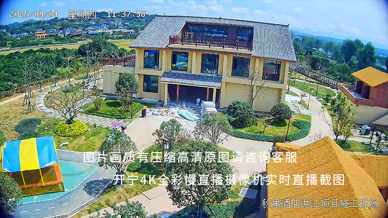 在文旅与酒店行业融合发展的趋势下,秋果酒店选址湖南洪江打造精品旅居空间,该项目不仅是当地文旅配套升级的重要载体,更因洪江古商城周边的特殊地理环境,对施工过程的可视化管理提出了极高要求。为破解传统施工监管中信息滞后、夜间管控薄弱、多方协同低效等难题,项目方引入开宁4G4K黑光臻全彩慢直播摄像机,构建起全天候、全场景的施工慢直播体系,实现了施工进度、安全质量与多方沟通的全方位优化。