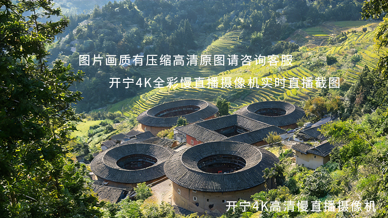 田螺坑土楼群以其独特的聚落布局、古朴的建筑形制成为客家文化的鲜活载体,其核心魅力不仅在于土楼本身的建筑美学,更在于不同时段光影流转下,土楼与山水田园相融的动态景致。传统的线下观赏与图文传播模式,难以完整留存这份动态美感,也无法让异地受众直观感受土楼群的静谧氛围与文化厚重感。针对土楼景区户外环境复杂、需长期稳定呈现景观细节的核心需求,开宁4K全彩高清慢直播智能球机构建了定制化解决方案,凭借优异的户外环境适应能力,可全天候不间断稳定运行,同时以超高清成像技术精准还原土楼的墙体肌理、聚落格局与周边田园的四季景致,让土楼的原生风貌得以完整留存与实时传递。